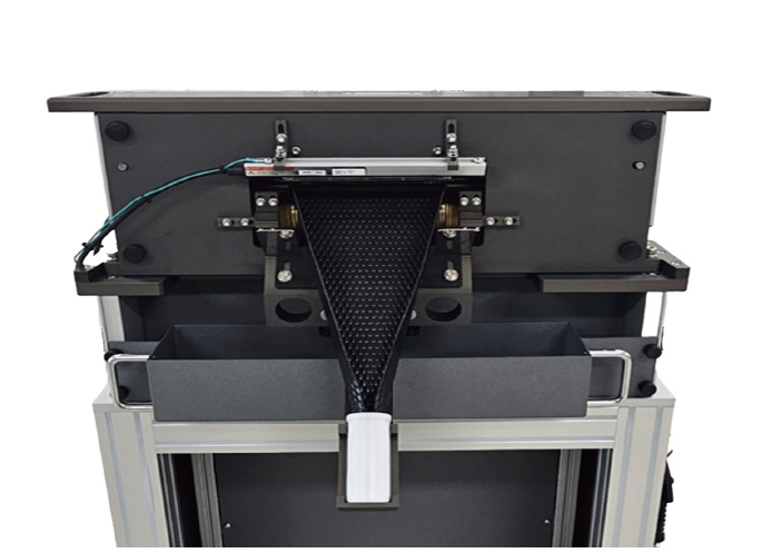 The system cuts into strips, places them inside bottom devices (manually fed), places top devices onto the bottom piece, presses them together, and then are discharged to collection bin to complete the assembly process.
